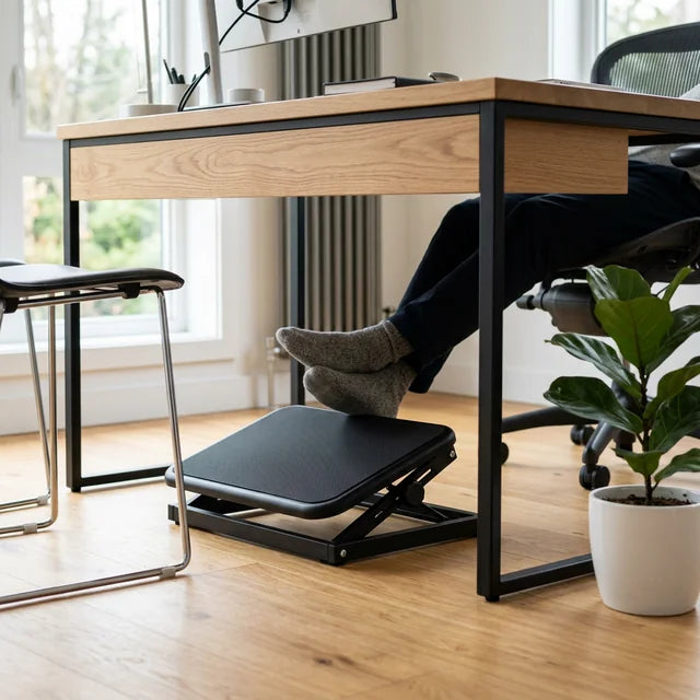 Le repose-pieds ergonomique maintient un angle optimal entre vos cuisses et vos mollets. Résultat : moins de tensions lombaires, une meilleure circulation sanguine et une sensation de légèreté dans les jambes, même après 8 heures de travail.